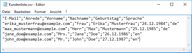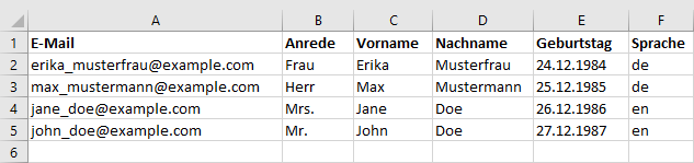 Abonnenten: ImportWahrscheinlich haben Sie bereits eine Liste von Adressen zusammengestellt, die Sie per Newsletter anschreiben möchten. Über das universelle CSV-Dateiformat lassen sich Ihre Adressen aus nahezu jeder Datenbank oder Tabellenkalkulation (z. B. Microsoft Office oder Open Office) exportieren und anschließend in Newsletter-Marketing-Center.de importieren. Um die Zuordnung der Spalten (z. B. Vorname, Nachname, E-Mail) beim Import zu erleichtern, sollte die erste Zeile Ihrer CSV-Datei aussagekräftige Spaltenüberschriftten enthalten. Ein Beispiel: