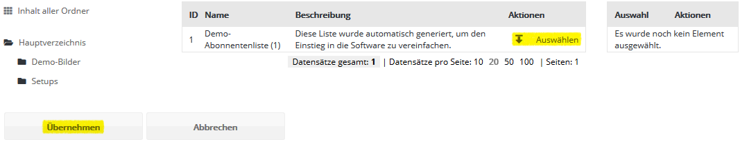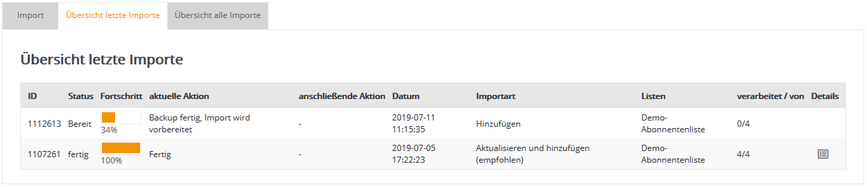 Schritt 3 - AbonnentenlistenWählen Sie nun aus, in welche Newsletter-Marketing-Center.de Abonnentenliste ihre CSV-Datei importiert werden soll. Falls Sie zuvor keine eigene Abonnentenliste in Newsletter-Marketing-Center.de angelegt haben (siehe Menü Abonnentenlisten), steht zum schnellen Einstieg die leere Abonnentenliste 'Demo-Liste' bereit. Diese Liste wird in der Regel bei der Einrichtung Ihres Newsletter-Marketing-Center.de Kontos angelegt und zur Demonstration mit einem Beispiel-Abonnenten befüllt.