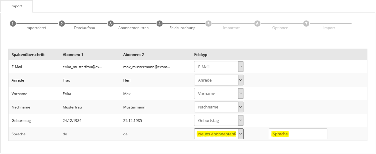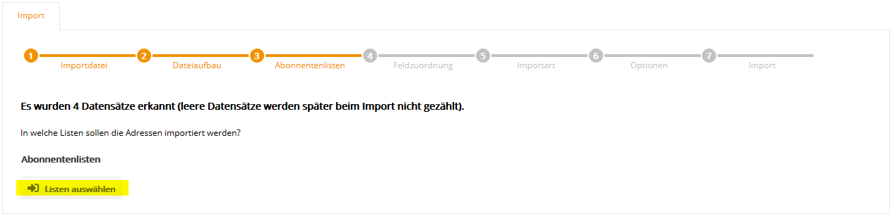 Auch die Auswahl mehrerer Abonnentenlisten ist möglich, falls Sie parallel in mehrere Listen importieren möchten. Klicken Sie nach Auswahl der gewünschten Liste(n) auf 'Übernehmen' und anschließend auf 'Weiter'. Der Name einer Abonnentenliste lässt sich im Menü Abonnentenlisten auch nachträglich jederzeit ändern. Schritt 4 - FeldzuordnungIn Schritt 4 teilen Sie Newsletter-Marketing-Center.de mit, welche Spalte (z.B. Vorname, Nachname) Ihrer CSV-Datei in welches Newsletter-Marketing-Center.de Abonnentenfeld importiert werden soll. Zum schnellen Einstieg sind typische Abonnentenfelder wie 'E-Mail', 'Anrede', 'Vorname' und 'Nachname' in Newsletter-Marketing-Center.de bereits vorhanden.