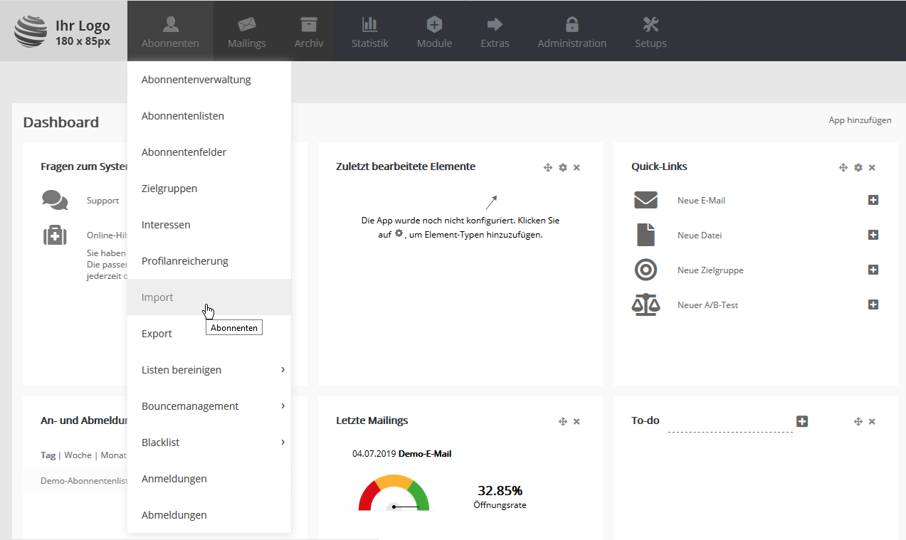 Zum Abspeichern Ihrer Daten wählen Sie bitte je nach Version Ihres Office-Paketes das Exportformat CSV UTF8 (Trennzeichen-getrennt) oder CSV (Trennzeichen-getrennt). Import Schritt für Schritt erklärtUm Ihre CSV-Datei in Newsletter-Marketing-Center.de zu importieren, wählen Sie im Menü 'Abonnenten' den Punkt 'Import':
