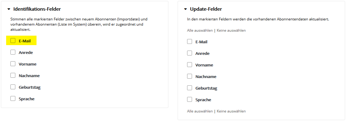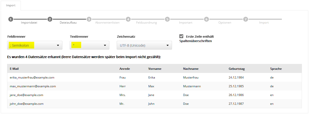 Die Option 'erste Zeile enthält Spalten-Überschriften' gibt an, ob die erste Zeile Ihrer CSV-Datei die Spaltenüberschriften (z. B. Vorname, Nachname, E-Mail) enthält oder sofort mit Abonnentendaten beginnt. Anschließend klicken Sie auf 'Weiter'. --> Tipp: Sollten Sie sich über das Format Ihrer CSV-Datei unsicher sein, können Sie sich deren Inhalt in einem Text-Editor anschauen. Hier ein Beispiel einer CSV-Datei mit Spaltenüberschriften, Semikolon als Spaltentrenner und Anführungszeichen als Texttrenner: