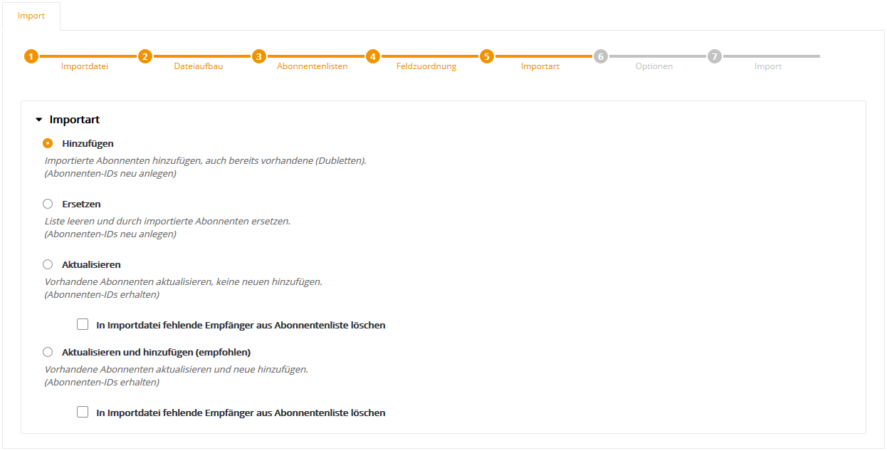 Auf der linken Seite sehen Sie am Beispiel der ersten beiden Abonnenten noch einmal den Inhalt Ihrer CSV-Datei. Auf der rechten Seite wählen Sie bitte den 'Feldtyp', der zum jeweiligen Inhalt passt. Dabei übernimmt Newsletter-Marketing-Center.de die Zuordnung automatisch, wenn der Name von CSV-Spaltenüberschrift und Newsletter-Marketing-Center.de-Abonnentenfeld übereinstimmt. Wird automatisch kein passendes Abonnentenfeld gefunden, ist der neue Feldinhalt zunächst auf 'nicht importieren' gesetzt. Wählen Sie in dem Fall entweder eines der vorhandenen Felder aus, oder nutzen Sie die Option 'neues Abonnentenfeld', um ein neues Feld anzulegen und ihm einen Namen zu geben. An dieser Stelle erhalten neue Felder grundsätzlich den Typ 'mehrzeiliger Text', siehe auch nachfolgender Tipp. Klicken Sie anschließend auf 'Weiter'. --> Tipp: Idealerweise sollten Sie sich bereits vor dem Import einmalig die Zeit nehmen, im Newsletter-Marketing-Center.de Menü 'Abonnentenfelder' alle Felder so anzulegen, dass Feldname und Feldtyp zu Ihren importierten Daten passen. Damit profitieren Sie zukünftig von der automatischen Feld-Zuordnung, was bei wiederkehrenden Importen nicht nur Zeit spart, sondern auch eventuelle Fehler durch unpassende Feldtypen oder die manuelle Feld-Zuordnung verhindert. Schritt 5 - ImportartHier legen Sie fest, wie Ihre neu importierten Daten mit den vorhandenen 'alten' Daten der gewählten Newsletter-Marketing-Center.de-Abonnentenliste(n) abgeglichen werden sollen.