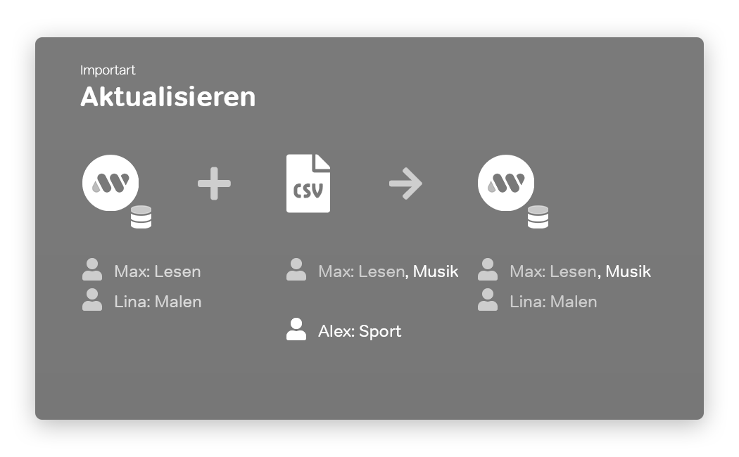 Im Beispiel würden Max und Lina gelöscht, anschließend Alex und Leon neu angelegt. --> Importart: Aktualisieren