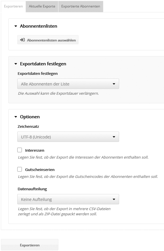Abonnenten: ExportAbonnentenlisten lassen sich aus Newsletter-Marketing-Center.de als CSV-Dateien exportieren. Damit können Sie lokale Backups Ihrer Abonnentenlisten anlegen oder den Inhalt bearbeiten und anschließend per Import-Methode 'Aktualisieren' erneut importieren.
