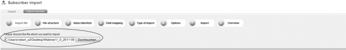 Save the file as a file with the feature 'CSV (Comma delimited)'. Apple user: If you own an apple computer, you will have to safe the file as 'CSV-Windows'. Newsletter-Marketing-Center.de does not run files in the Mac format. Step 1 – Import fileOn the navigation bar click on 'Subscribers' and then go to the navigation subitem 'Import'. This is the way how you get to the menu-guided import function of Newsletter-Marketing-Center.de. First, you will have to choose the file which you want to import; |