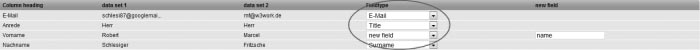 if the first line of your address file contains (as shown in the example above) the column headings, leave the item 'First line contains column headings' marked . Otherwise, if your address file starts right away with the subscriber data, unmark this option. Step 3 – Subscriber ListsChoose the subscriber list to which you want to import the addresses. Subsequently click on 'Next'. Step 4 – Field MappingNow you are asked to match the field names of your subscriber data with those of Newsletter-Marketing-Center.de. In order to do so, please choose in the drop down menus the associations which correspond to field information displayed to the left of these menus. If there does not exist a matching subscriber field, choose 'New Field' and enter a name for the subscriber field that needs to be created. Click 'Next'.