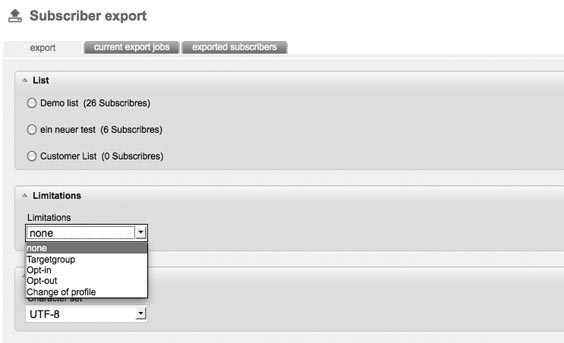 Subscribers lists can be exported from Newsletter-Marketing-Center.de as CSV – files. An advantage, for example, is that you can back up the address lists in this way. In the tab 'Export’, you can make choices of the lists that have to be exported. Per export only one subscriber list can be chosen. If you only want to export certain data records, you can decide on 'Limitations’. |