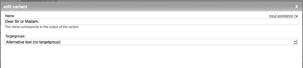 What to do with those subscribers, whose first name you don't know? In this case you need a second title-variant inside your personalization. With a click on 'create variants' you can create your second variant. Chose a targetgroup, where you filter 'no firstname'. You can enter an alternative text into the name-field like 'Hello subscriber,' or 'Dear reader, '.