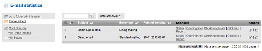 Here you find the statistics of all sent mails. For easier access Newsletter-Marketing-Center.de already includes a demo-mail you can view. |