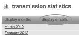 In the transmission- statistic you see the data collected from Newsletter-Marketing-Center.de (Traffic, Total). Also you see, if exist, the numbers of test-sendings, clicks on the subsriber-link and the number of subscribers who have completed the optin-confirmation. Next to the view 'display months' you also can select 'display e-mails'. So Newsletter-Marketing-Center.de outputs the above mentioned figures for each mailing.