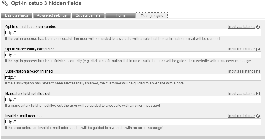 Now enter a name and an optional description for your optin setup. Then choose the 'mode' (important). The following modes are supported by 'Newsletter-Marketing-Center.de': Double Opt-in with confirmation e-mail (recommended as the only legally secure login variant): Interested party visits a website with an optin setup form. He enters his data into the form. He gots an e-mail with content like this: „Thank you for your optin. Please confirm the registration confirmation link to complete your registration.“ He clicks the link. Registration is completed. He gots a „welcoming“ e-mail. You can integrate information about your company and a certain design as well. Double Opt-in: Like described before, but without sending of a „welcoming“ e-mail. Confirmed Opt-In: Nach Anmeldung auf der Webseite wird sofort eine automatische Begrüßungsnachricht versendet. Single Opt-in: No e-mails will be send. There just will be a message in your browser, that registration was successfull. According to the mode you've choosed, you have to adapt different sub-options. In Tab 'advanced settings' you can deposit your e-mail address in field 'e-mail forwarding', to be informed about new subscribers. In field 'mailing for later delivery' you can determine your last sended newsletter. All new subscribers will receive your last mailing and don't have to wait for another one. To protect your optin-form against abuse, activate the invisible captcha . Captchas are often used to check if petitions are produced by a machine (robot, short: bot) or a real person. Bots are often used abusive to generate masses of subscriptions. Choose your favorite subscriberfields, which should be filled in in next tab 'Form'. After clicking 'Add subscriberfield' a pop up appears, where you can select and add subscriberfields to your optin-form. Furthermore you can add one or more subscriberlists as option(s) in a ceckbox through the button 'add subscriberlist'. Click 'sort formfields' to edit order of your fields. Click 'test form' to check your form by a preview of your optin-form. Next tab: 'Dialog pages':