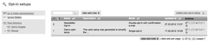 Through 'Setups' and 'Optin Setup' you can create forms, which can be included into your website. So interested parties can login automatically on your website for your subscriberlist(s). Please note: Requirement for a successfull 'optin setup' is to create an e-mail with type 'dialog mailing' for registration confirmation and welcoming, which got the status 'activated'. Otherwise those mailings will be lacking in the shortlist of mailings which you can choose for your optin setup. For an esier start Newsletter-Marketing-Center.de gots a „Demo optin setup“ for you. Created optin setups can be 'opend' afterwards for editing, 'moving' to another folder or 'deleting'. If you have moved an optin setup into another folder, click 'open folder' to get into. Create new Optin setup |