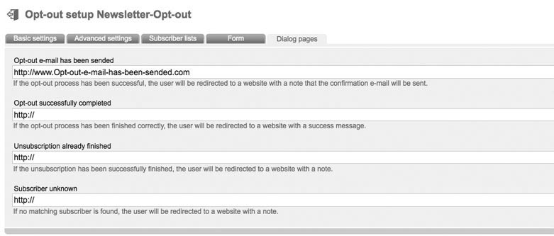 Enter a name and an optional description. Choose the 'mode' (important). The following modes are supported by 'Newsletter-Marketing-Center.de': Double-optout with confirmation e-mail: after unsubscribe from your website or your newsletter a confirmation email will be send automatically. Optout will be activated after clicking the confirmation link in this email. After successful unsubscription the former subscriber will get a last email („You unsubscribed successfully of our newsletter.“) Double Optout: Like described before, but without sending of a „successful unsubscription“ e-mail Confirmed Opt-Out (recommended): After unsubsubscription on your website or in your newsletter a „successful unsubscription“ email will be sended immediately. Single Optout: No e-mails will be send. There just will be a message in your browser, that optout was successfull. In Tab 'advanced settings' you can deposit your e-mail address in field 'e-mail forwarding', to be informed about unsubscriptions. Tab 'subscriberlists': Choose your favorite subscriberlist(s), where all unsubscriptions should be logged out. Select the subscriberfields, which should be filled out by your subscribers in tab 'Form'. After clicking 'create form fields' a popup appears, where you can choose and add subscriber fields to your form. Click 'sort formular fields' to arrange your fields. Click 'test form' to open a new tab in your browser with a preview of your form. Source Code of your website is genereated by 'Newsletter-Marketing-Center.de' by clicking 'Formular soruce code'. A popup appears with your source code. Last tab: Dialog pages |
