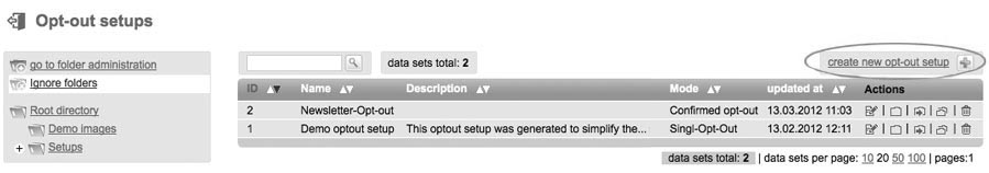 Optout setups allow your subscribers to unsubscribe automatically from your subscriberlist. Please note: Requirement of functionality is to create dialog-mailings (according to module-selection) for optout confirmation or farewell. They need to be 'activated'. Otherwise this mailings will be missed in list box while adaption of your potout setup. Created optout setups can be 'opend' afterwards for editing, 'moving' to another folder or 'deleting'. If you have moved an opout setup into another folder, click 'open folder' to get into. Create new optout setup |