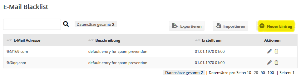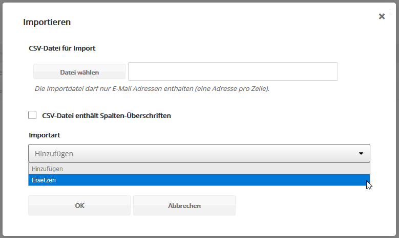 ImportierenSie haben die Möglichkeit, E-Mail-Adressen aus einer CSV-Datei in die Blacklist zu 'importieren'.
