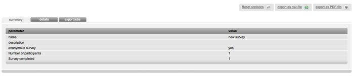 For interpretation of your survey-results click 'survey statistics'. In upper part you can see a summary of analysis information. Underneath you will find all questions in detail. Remove your statistic with a click on 'reset statistic'. All documented information will be reset to zero. Furthermore you've got the possebility to export all results into a .csv or .pdf file.