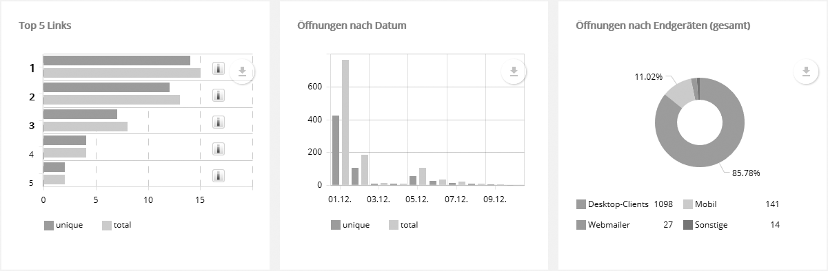 Per Klick auf 'Vollbild' wird die Karte im gesamten Fenster dargestellt. Direkt unter dem Vollbild-Link können Sie per Download-Button die Grafik der Karte in verschiedenen Formaten herunterladen. Hinweis: Obwohl IP-Adressen grundsätzlich nicht an einen bestimmten Ort gebunden sind, lässt sich durch die bekannten IP Adressräume von Internetprovidern, Universitäten und ähnlichen Einrichtungen in vielen Fällen der Standort ermitteln. Da regionale Einwahlknoten häufig einen festen IP-Adresspool besitzen, funktioniert das Verfahren auch bei dynamischer IP-Vergabe. Für die Zuordnung nutzt Newsletter-Marketing-Center.de eine regelmäßig aktualisierte lokale Kopie einer Geotargeting-Datenbank, die ein externer Dienstleister zur Verfügung stellt. --> Top 5 Links + Öffnungen nach Datum und EndgerätenWie bei jedem anderen Diagramm lassen sich auch hier per Download-Button (rechte obere Ecke) die angezeigten Daten als Grafik- oder Excel-Datei herunterladen. Einzelne Diagramm-Segmente lassen sich ein- oder ausblenden, indem man auf den entsprechenden Punkt in der Legende klickt, z.B. auf 'Desktop-Clients' im Diagramm 'Öffnungen nach Endgeräten'. Damit werden die übrigen Segmente auf 360° gezoomt und deren Prozentzahlen passen sich der neuen Anordnung an. So lässt sich das Verhältnis beliebiger Segmente direkt vergleichen.