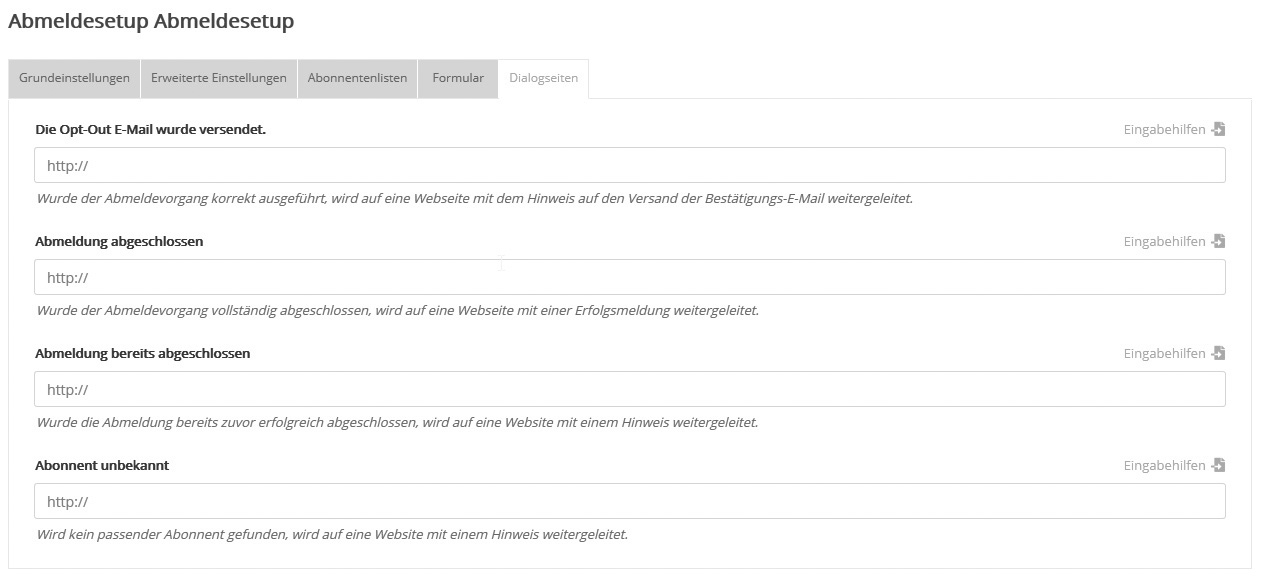 AbonnentenlistenJe nachdem, ob die Abmeldung per Newsletter-Link oder per Website-Formular stattfindet, wird der Abonnent aus folgenden Listen abgemeldet: Variante 1: Abmeldelink im NewsletterFür Standardmails gilt: Zusätzlich zu den auf dem Reiter 'Abonnentenlisten' gewählten Listen findet die Abmeldung auch in den angeschriebenen Listen statt. Für Kampagnen- und Dialogmails gilt dieser Zusatz nicht, da diese nicht an eine bestimmte Liste verschickt werden. Variante 2: Abmeldeformular auf WebsiteDie Abmeldung findet in den unter 'Abonnentenlisten' markierten Listen statt, und wenn vorhanden, dann auch in den direkt im Formular zur Auswahl durch den Nutzer angebotenen Listen (siehe nächster Abschnitt 'Formular'). Beides gleichzeitig ist nicht möglich. Das heißt: Sobald Sie eine Liste im Reiter 'Abonnentenlisten' markiert haben (und damit fest vorgeben), kann sie nicht gleichzeitig im Abmelde-Formular (ab)wählbar sein. Im dem Fall wird sie automatisch aus dem Formular entfernt und umgekehrt. Sonderfall beim Abmeldeformular: Ist keine Liste zur Abmeldung markiert und auch im Formular keine enthalten, dann findet die Abmeldung in allen Listen statt. Damit wird der Abonnent auch aus der 'Abonnentenverwaltung' entfernt. FormularHier erstellt Newsletter-Marketing-Center.de automatisch den Quellcode für ein Abmeldeformular, das Sie auf Ihrer Website einbinden können. Den Inhalt des Formulars stellen Sie per Drag&Drop zusammen. Die Bedienung ist identisch zum Anmeldeformular-Editor. Nach Klick auf den Button 'Test des Formulars' wird Ihr neues Abmeldeformular angezeigt und die Funktion lässt sich anhand realer Abmeldungen testen. Geben Sie gültige und ungültige Abonnentendaten ein, um die entsprechenden Textmeldungen bzw. Dialogseiten zu prüfen. Ein während des Tests abgemeldeter Abonnent lässt sich unter 'Abonnenten' -> 'Abmeldungen' wiederherstellen. --> Hinweis zu Abmeldungen beim Testversand: Solange es sich um den Testversand eines Mailings handelt, findet bei Klick auf den Abmeldelink keine Abmeldung statt. Stattdessen wird lediglich eine Bestätigung angezeigt, ob das Abmeldesetup korrekt eingerichtet wurde. Erst beim späteren realen Versand findet eine tatsächliche Abmeldung statt und es erscheint die von Ihnen eingestellte Dialogseite, die Sie unter 'Formular testen' jederzeit testen können. Dialogseiten |